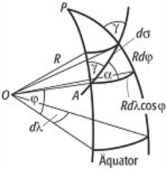 Loxodrome, Kurve auf der Kugeloberfläche, die, in einem Punkt P unter dem Azimut γ beginnend, alle Meridiane unter dem Winkel γ schneidet. Jede Loxodrome, deren Azimut γ nicht die Werte 0º oder 90º annimmt, ist keine geschlossene, in sich selbst zurückkehrende Kurve. Für γ = 0º ist der Meridian zugleich Loxodrome. Für γ = 90º bilden der Parallelkreis sowie auch der Äquator die Loxodrome. Unter jedem anderen Schnittwinkel γ gegen den Meridian des Anfangsortes beginnende Loxodromen winden sich unter konstantem Winkel γ spiralförmig um die Erdkugel und nähern sich dem Pol. Der Schnittwinkel oder Kurswinkel der Loxodrome zwischen zwei Oberflächenpunkten A und B sowie die loxodromische Distanz AB ergeben sich durch Integration einer Differentialgleichung, die aus dem Differentialdreieck ( Abb. ) aufgestellt wird, das aus dem Poldreieck (geographische Koordinaten) hervorgeht. In der Abbildung gilt: