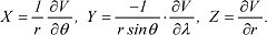 In geozentrischen Polarkoordinaten r, θ, λ, wenn r den radialen Abstand vom Zentrum der Referenzkugel, θ den Polabstand oder θ = 90º-β mit β als der geographischen Breite, und wenn λ die geographische Länge ostwärts von Greenwich aus bezeichnet, erhält man für die Feldkomponenten durch Gradientenbildung: