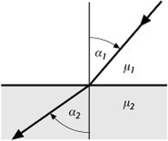 magnetische Brechung: magnetische Brechung einer Feldlinie an einer Grenze zwischen zwei Materialien unterschiedlicher Permeabilität μ. magnetische Brechung: