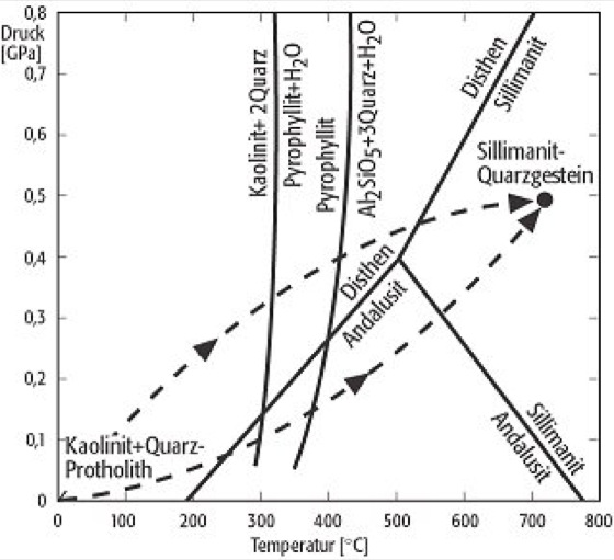 Ein sehr einfaches Beispiel für den Ablauf von metamorphen Mineralreaktionen ist in Abb. 2 illustriert: Ein nur aus Quarz und Kaolinit bestehendes Sedimentgestein wird versenkt und erfährt somit Druck- und Temperaturerhöhungen entsprechend den herrschenden geothermischen Gradienten. Bis zu einer Temperatur von 300ºC kommt es nur zur Verringerung des Porenraumes durch Kompaktion und Wachstum der vorhandenen Minerale (Diagenese). Dann wird die Paragenese Kaolinit+Quarz instabil und der Kaolinit zerfällt in einer Dehydratisierungsreaktion in das weniger Hydroxylgruppen enthaltende Schichtsilicat Pyrophyllit und Wasser. Das in den Intergranularraum freigesetzte Wasser, das unter einem Druck steht, der dem lithostatischen entspricht, wird die Tendenz haben, das Gestein nach oben zu verlassen. Geht die Versenkung und Erwärmung weiter, so zerfällt bei 350-400ºC auch der Pyrophyllit je nach geothermischem Gradienten unter Bildung von Disthen (bei niedrigeren) oder Andalusit (bei höheren Gradienten). Das wiederum frei werdende Wasser spielt für den Fortgang der Reaktion eine wichtige Rolle. Mit weiterer Erwärmung werden sowohl Disthen als auch Andalusit in Sillimanit umgewandelt. Im Gegensatz zu den rasch ablaufenden Entwässerungsreaktionen ist die Kinetik dieser polymorphen Transformationen jedoch sehr träge, so daß die Umwandlung nicht vollständig sein muß.