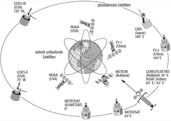 meteorologisches Satellitensystem, wird von der Weltorganisation für Meteorologie koordiniert und ist als Bestandteil des globalen Beobachtungssystems ( Abb. ) ein Beitrag zur Welt-Wetter-Wacht. Es besteht aus zwei Teilsystemen, nämlich fünf geostationären und mindestens zwei polarumlaufenden Wettersatelliten. Das System ist derart abgestimmt, daß eine kontinuierliche und global lückenlose Erdbeobachtung gewährleistet ist. Die geostationären Satelliten erfassen nahezu kontinuierlich das Gebiet der Erde zwischen ca. 70 Grad Nord und Süd, jedoch nicht die Polargebiete. Jeder sonnensynchrone, polarumlaufende Satellit erfaßt dagegen zweimal pro Tag die gesamte Erde in einzelnen, zeitlich versetzten Beobachtungsstreifen, die im Falle der National Oceanic and Aeronautical Agency-Satelliten eine Breite von ca. 3000 km haben. Die operationellen geostationären Satelliten sind: METEOSAT, GOES, GMS sowie GOMS; die polarumlaufenden Satelliten sind stets zwei Satelliten der National Oceanic and Aeronautical Agency sowie METEOR. [WBe]