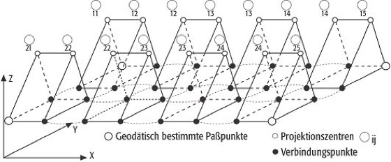 Modelltriangulation, Verfahren der Mehrbildauswertung von Meßbildern eines Bildverbandes zur Bestimmung der Daten der äußeren Orientierung und der Objektkoordinaten von Paßpunkten in der Photogrammetrie. Geometrisches Grundelement der Modelltriangulation sind die aus den Aufnahmestrahlenbündeln von jeweils zwei benachbarten Bildern, Bildpaaren, eines Bildstreifens gebildeten Modelle. In die Ausgleichung gehen die gewichteten Modellkoordinaten der Projektionszentren und der ausgewählten Verbindungspunkte der Modelle, die geodätisch bestimmten Objektkoordinaten der Paßpunkte sowie die bei Luftbildern aus GPS-Messungen ermittelten Objektkoordinaten der Projektionszentren bei der Bildaufnahme ein ( Abb. ).