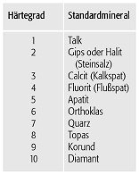 Mohssche Härteskala (Tab.): Ritzhärte nach Mohs. Mohssche Härteskala (Tab.):