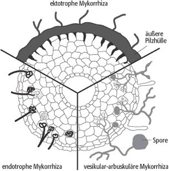 Mykorrhiza, [von griech. mykos = Pilz und rhiza = Wurzel], Symbiose zwischen Pilzen und den Wurzeln höherer Pflanzen. In dieser engen physiologischen und morphologischen Gemeinschaft wird der Pilz von den Pflanzen mit Kohlenhydraten und Aminosäuren versorgt. Er begünstigt dagegen die Wasser- und Mineralstoffaufnahme der Pflanze (v.a. Phosphat) und hemmt die Schwermetallaufnahme. Durch Schadstoffe, die auf den Pilz einwirken, kann es auch zu einer anhaltenden Schwächung der Bäume kommen. Für einige Baumarten ist die Mykorrhiza unter natürlichen Bedingungen zur normalen Entwicklung notwendig, besonders an extremen Standorten. Es werden drei Typen von Mykorrhiza unterschieden ( Abb. ): Die ektotrophe Mykorrhiza bildet um die Wurzeln v.a. von Waldbäumen eine dichte Hülle aus Pilzmycel. Bei der endotrophen Mykorrhiza dringen die Hyphen in tiefere Regionen der Wurzel und in die Zellen ein. Dieser Typ ist v.a. bei Orchideen und Heidekrautgewächsen verbreitet. Bei der vesikulär-arbuskulären Mykorrhiza, die auf zahlreichen Kulturpflanzen vorkommt und auch besonders in den Tropen verbreitet ist, bilden die Hyphen in den Wurzelzellen sack- und baumartige Saugorgane aus. [DR]
