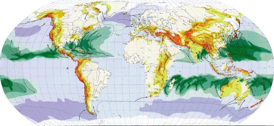 Naturkatastrophe 2: Weltkarte der Naturgefahren. Die grünen Bereiche stellen die wahrscheinliche Maximalintensität tropischer Wirbelstürme dar (hellgrün = 118-153 km/h bis dunkelgrün = mehr als 250 km/h). Die Pfeile stehen für die Hauptzugbahnen tropischer und außertropischer Wirbelstürme. Die gelb-roten Bereiche markieren die wahrscheinliche Maximalintensität von Erdbeben, von hellgelb für die Stufe V (und darunter) einer modifizierten Mercalli-Skala bis dunkelrot für die Stufe IX. Weitere Naturgefahren sind hoher Seegang (dunkelblauer Bereich in den Ozeanen) und Packeis (weiß-blau gesprenkelter Bereich). Die blau gepunktete Linie stellt die Grenze der Eisbergvorstöße dar. Naturkatastrophe 2: