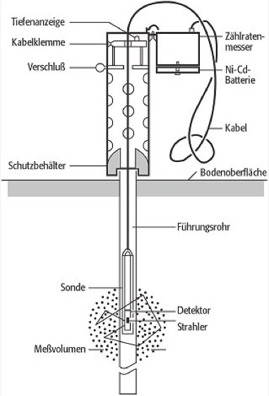 Neutronensonde, Sonde, die eine Neutronenquelle enthält ( Abb. ). Sie emittiert schnelle Neutronen, deren Geschwindigkeit durch Zusammenprall mit massengleichen H+-Ionen infolge elastischen Stoßes soweit vermindert wird, daß sie von diesen eingefangen werden. Dabei werden γ-Strahlungsquanten frei, deren Intensität gemessen wird. Die so entstandene (Sekundär-)Intensität ist ein Maß für den Gehalt an H+-Ionen im Gebirge oder Lockergestein und damit auch ein Maß für den Wassergehalt und die Porosität. Nach Abzug der γ-Eigenstrahlung des Gebirges kann somit die Porosität und damit die Grundwasserführung gemessen werden. Neutronensondenmessungen werden häufig im Rahmen von geophysikalischen Bohrlochmessungen eingesetzt. Die Neutronensonde, die in ein vorgebohrtes Loch in den Untergrund eingeführt wird, erlaubt die Bestimmung der Feuchtigkeitsänderungen in der wasserungesättigten Zone. Von einer Neutronenquelle werden schnelle, energiereiche Neutronen (10 MeV bis 10 keV) in den Untergrund abgestrahlt, die von Wasserstoffkernen gebremst werden, bis sie energiearm (thermisch, 1 eV bis 0,01 eV) werden. Als Neutronenquelle dient häufig ein hochsicherer 241Americium-9Beryllium-Strahler. 241Am ist ein α-Strahler (42He), dessen Partikelstrahlung bei der Fusion mit Beryllium zu elementarem Kohlenstoff schnelle Neutronen mit einer Reaktionsenergie von ungefähr 3-10 MeV emittiert. Diese thermischen Neutronen werden von Kalium-, Eisen-, Chlorid- und anderen Element-Kernen aufgefangen, wobei eine γ-Strahlung auftritt. Für das Abbremsen von Neutronen (n) sind ausschließlich Wechselwirkungsprozesse mit den Atomkernen maßgebend.