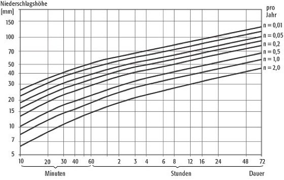 Niederschlagshöhe-Dauer-Häufigkeits-Beziehung: Niederschlagshöhe als Funktion der Niederschlagsdauer für verschiedene Unterschreitungshäufigkeiten. Niederschlagshöhe-Dauer-Häufigkeits-Beziehung: