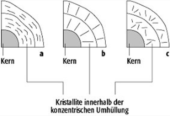 Ooide 1: Mikrostrukturen in Ooiden: a) tangential, b) radial und c) unregelmäßig orientierte Kristallite innerhalb der Ooidhüllen. Ooide 1: