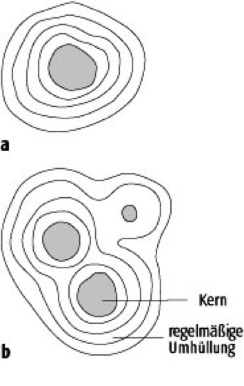Ooide 2: Schema a) eines einzelnen Normalooids und b) eines Mehrfachooids. Ooide 2: