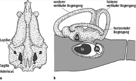 Otolithen, Gehörsteinchen, Statolithen, kommen im akustischen Organ der höheren Fische (Actinopterygii und Sarcopterygii) vor und stellen als Besonderheit innerhalb der Wirbeltiere nicht Teile des Skeletts dar. Sie sind Konkretionen, die im wesentlichen aus Calciumcarbonat (Aragonit) sowie untergeordnet (0,2-10%) aus einer organischen Substanz, dem Otolin, bestehen. Sie wachsen in konzentrischen Schichten und werden nach bisheriger Kenntnis von der Wand des Labyrinths sezerniert. Der Anwachsrhythmus entspricht in der Regel je einer kalkigen und organischen Schicht pro Jahr. Die Zahl der Otolithen innerhalb der Knochenfische ist unterschiedlich: Die Actinopterygii (Strahlenflosser) besitzen in der Regel drei Otolithen, die je nach ihrer Lage im häutigen Labyrinth als Sagitta, Asteriscus und Lapillus bezeichnet werden ( Abb. 1). Dagegen ist bei den Coelacanthiden (z.B. der rezente Quastenflosser Latimeria) nur ein Gehörsteinchen bekannt, während die Dipnoi (Lungenfische) deren zwei besitzen, nämlich die Sagitta und den Lapillus. Die Otolithen der linken und rechten Körperseite sind spiegelbildlich geformt.