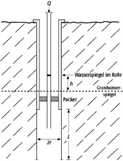 Packertest 1: Bestimmung des Durchlässigkeitsbeiwertes durch Packertests (L=Länge des unverrohrten Teils des Bohrloches, h=Höhe des Wasserspiegels nach Auffüllung über dem Ausgangsspiegel, Q=Wassermenge, r=Halbmesser des unverrohrten Bohrloches). Packertest 1: