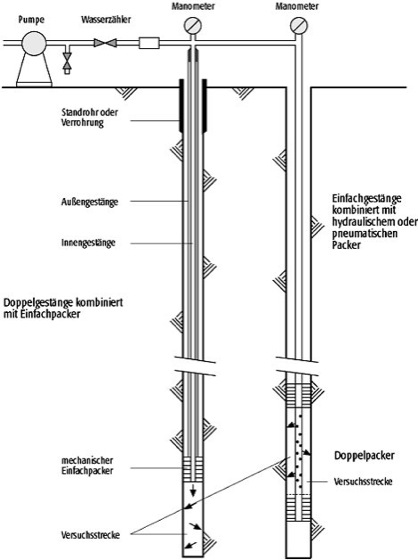 Packertest, Sammelbegriff für hydraulische Versuche im Bohrloch oder Brunnen, die beim Einfachpackertest im oberhalb bzw. unterhalb des Packers befindlichen und hydraulisch abgetrennten Abschnitt, beim Doppelpackertest auch abschnittsweise in der Strecke zwischen zwei Packern durchgeführt werden. Einfachpackertests werden in teiloffenen Bohrlöchern durchgeführt, die bis unter den Wasserspiegel verrohrt sind. Durch den Packer führt eine dünnere Rohrtour, über die für den unteren Bohrlochabschnitt gültige Auffüllversuche, Slug-Tests oder Einschwingverfahren zur Ermittlung der hydraulischen Kennwerte des Grundwasserleiters gefahren werden können. Doppelpackertests werden im unverrohrten Bohrloch durchgeführt, wobei der Streckenabschnitt zwischen den beiden Packern mit den oben angeführten Versuchen getestet werden kann. Die Zuverlässigkeit der Ergebnisse hängt dabei von der Dichtigkeit der Packer, der Beschaffenheit der Bohrlochwand und des umgebenden Gebirges ab bzw. kann durch Umläufigkeiten im Gebirge herabgesetzt sein. In der Ingenieurgeologie werden für felsmechanische Untersuchungen Wasserdruck-Tests über einfach oder doppelt abgepackerte Bohrlochabschnitte eingesetzt, bei denen Wasser unter unterschiedlichen Drücken zur Ermittlung des kf-Wertes von Festgesteinen, z.B. im Untergrund von Staudämmen, eingepreßt wird ( Abb. 1 u. 2). [BK]