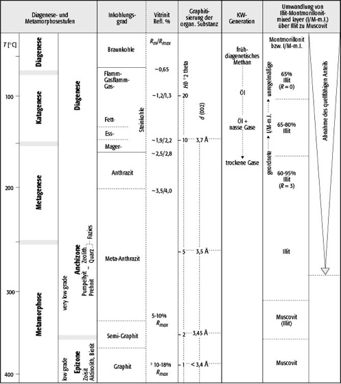 In sedimentären Abfolgen verändern sich Tonminerale in Abhängigkeit von Temperatur und Tiefe (Druck). Die Veränderung verläuft von dem quellfähigen Montmorillonit über den nicht quellfähigen Illit bis hin zu Glimmermineralen (Muscovit). Dabei nimmt die sog. Illitkristallinität zu. Diese wird röntgenographisch bestimmt und als Weaver-Index oder als Kübler-Index angegeben. Zwischen 50ºC und 120ºC existieren ungeordnete Illit/Montmorillonit-Wechsellagerungsminerale mit einem Illit-Schichtanteil von 65%. Etwa im Temperaturintervall von 120ºC bis 150ºC treten Illit/Montmorillonit-Wechsellagerungsminerale auf, die einen Illit-Anteil von 65-80% haben. Bei einer Temperatur von ca. 200ºC steigt dieser Anteil auf Werte zwischen 80 und 95%. Der Übergang von Illit zu Muscovit erfolgt bei einer Temperatur von ca. 300ºC. Untersuchungen zu den Beziehungen zwischen Illitkristallinität und Inkohlungsgrad (abgeleitet aus der Vitrinitreflexion) zeigen, daß die Zunahme der Illitkristallinität sehr viel mehr Zeit benötigt als dies für die Inkohlung von organischem Material der Fall ist. So kann eine relativ kurzzeitige Erwärmung zu einem hohen Inkohlungsgrad, aber nur zu einer vergleichsweise niedrigen Illitkristallinität führen. Inkohlungsgrad und Illitkristallinität können somit nicht unmittelbar miteinander verglichen werden. Beide Parameter geben unterschiedliche Informationen.