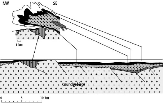 palinspastisches Profil: verallgemeinerter Profilschnitt durch eine stark NW-vergente Falte im helvetischen Deckenstapel der Schweizer Alpen. palinspastisches Profil: