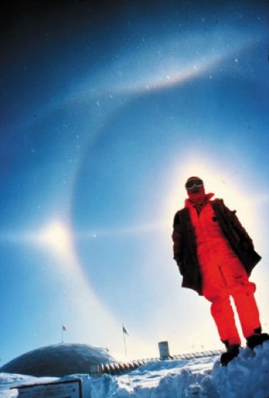 Parry-Bogen: Die Sonne befindet sich hinter der Person. Zu erkennen sind der kleine Ring, eine Nebensonne sowie der Horizontalkreis. Oberhalb der Person sind die oberen Berührungsbögen und der Parry-Bogen sichtbar. Parry-Bogen: