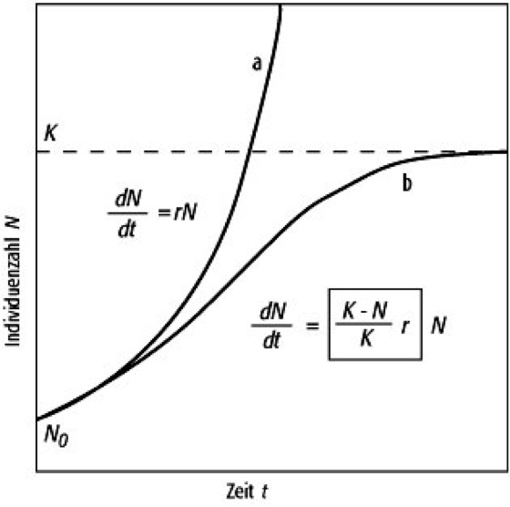 Population 1: exponentielles (a) und logistisches (b) Wachstum von Populationen. N=Individuenzahl pro Flächeneinheit, N0=Individuenzahl zur Zeit 0 , r=spezifische Zuwachsrate, K=Kapazität (Tragfähigkeit), t=Zeit. Population 1: