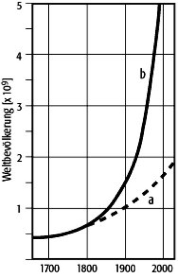 Population 2: hyperexponentielles Wachstum der menschlichen Weltbevölkerung (b), verglichen mit einem hypothetischen, exponentiellen Weltbevölkerungswachstum, berechnet auf der Grundlage der Wachstumsraten von 1650-1800 n. Chr. (a). Population 2: