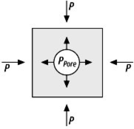 Bei der Auswirkung von Druck auf den Porenraum müssen hydrostatischer Druck und deviatorische Druckbedingungen unterschieden werden. Hydrostatischer Druck wirkt der temperaturinduzierten Rißbildung entgegen (thermische Ausdehnung, Petrophysik). Im Labor werden ca. 100 MPa hydrostatischer Druck benötigt, um die bei einer Temperaturerhöhung um 100 K induzierten Risse wieder zu schließen. Dabei müssen isostatischer Druck und deviatorische Streßbedingungen unterschieden werden. Dem äußeren Druck kann ein Porendruck entgegenwirken. Wird in einem offenen System gearbeitet (›drained conditions‹), kann der Porendruck abgebaut werden. Der äußere Druck entspricht damit dem wirksamen (effektiven) Druck. Wird kein Transport der Porenfüllung nach außen zugelassen (›undrained conditions‹) baut sich in den Poren und Rissen ein Gegendruck auf ( Abb. 1). Der effektive (wirksame) Druck auf das Gestein Peff ergibt sich aus dem mittleren Porendruck Ppore und dem äußeren Druck P: