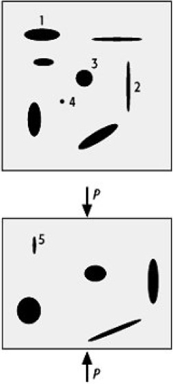 Porenraum 3: Änderung der Rißgeometrie durch deviatorischen Streß. Risse, die senkrecht zum Druck P orientiert sind (1), verschwinden bei geringen Drücken, während Risse gleicher Größe mit einer anderen Orientierung (2) erhalten bleiben. Dabei kann es zu einer Volumenzunahme des Risses kommen (2). Sphärische Poren werden ausgelenkt (3) bzw. bei geringeren Volumina oder hohen Drücken geschlossen (4). Bei der Deformation können neue Risse induziert werden (5). Porenraum 3: