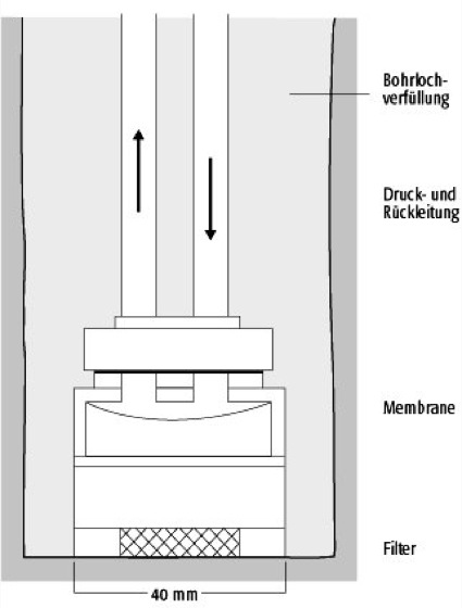 Porenwasserdruckgeber: Funktionsprinzip eines Porenwasserdruckgebers. Der Filterstein überträgt den Porenwasserdruck auf die Membran des Überdruckventils. Der Druck, der zur Öffnung der Überdruckmembran angelegt werden muß, entspricht dem Porenwasserdruck. Porenwasserdruckgeber: