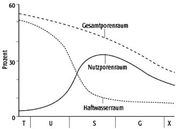 Porosität: Beziehung zwischen Gesamtporen-, Nutzporen- und Haftwasserraum in Abhängigkeit von der Korngröße klastischer Sedimente (T=Ton, U=Schluff, S=Sand, G=Kies, X=Steine). Porosität: