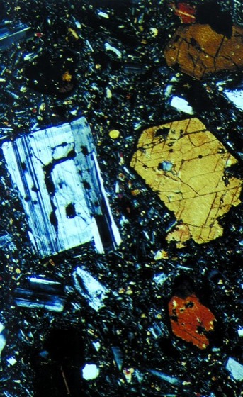 porphyrisch: porphyrisches Gefüge in Vulkanit mit Hornblende und Plagioklas-Einsprenglingen (Dünnschliff unter gekreuzten Polarisatoren, Bildhöhe 4,2 mm). porphyrisch: