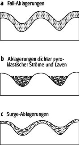pyroklastischer Transport: unterschiedliche Geometrien der Ablagerungen der drei pyroklastischen Transportformen Fall, surge und Strom, sowie von Lavaströmen: a) Fallablagerungen bedecken die Landschaft mit einer Decke von lokal gleicher Mächtigkeit. b) Dichte pyroklastische Ströme (wie auch Laven) folgen der Topographie wie Wasser. c) Surges und hochverdünnte pyroklastische Ströme konzentrieren Transport und Ablagerungen in den topographisch tieferen Bereichen. pyroklastischer Transport: