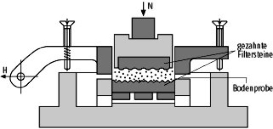Rahmenscherversuch 1 : Scherbüchse nach Casagrande (H=Horizontallast, N=Normallast). Rahmenscherversuch 1