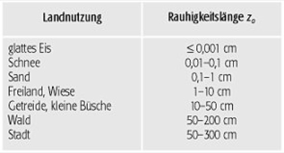Rauhigkeitsparameter (Tab.): Rauhigkeitslänge über verschiedener Landnutzung. Rauhigkeitsparameter (Tab.):