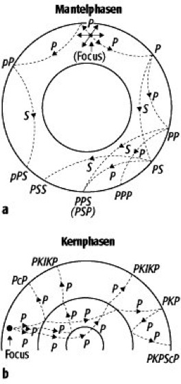 Raumwellen, seismische Wellen, die sich von der seismischen Quelle durch das Erdinnere zur Erdoberfläche ausbreiten ( Abb.). Raumwellen werden durch fortlaufende Brechung nach Erreichen der Scheiteltiefe oder nach Reflexion an seismischen Diskontinuitäten wieder zur Erdoberfläche zurückgeführt. Seismische Diskontinuitäten verursachen neben Reflexionen auch Konversionen von P nach S und S nach P. Dadurch können in einem Seismogramm eine Vielzahl von Wellentypen erzeugt werden. Zu ihrer Bezeichnung wird eine einfache Nomenklatur benutzt. P und S bezeichnen Kompressionswellen und Scherwellen im Erdmantel. Reflexionen beobachtet man häufig von der Erdoberfläche (z.B. PP, SS, PS, SP, PSS) und von der Kern-Mantel-Grenze (PcP, ScS, ScP). Kompressionswellen, die durch den äußeren Kern gelaufen sind werden mit PKP bezeichnet. Scherwellen im äußeren Kern werden nicht beobachtet. Bei Wechselwellen, wie z.B. SKS oder PKS wird der äußere Erdkern immer als Kompressionswelle durchlaufen. Wellen durch den inneren Erdkern werden mit I für Kompressionswellen (z.B. PKIKP) und J für mögliche, aber noch nicht einwandfrei beobachete Scherwellen gekennzeichnet. Reflektionen von der Grenze zwischen innerem und äußeren Erdkern werden mit i angezeigt, zum Beispiel PKiKP. Die durch den Erdkern erzeugte Schattenzone wird durch PKIKP und PkiKP Phasen aufgehellt. [GüBo]