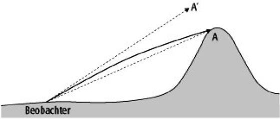 größer als 1 ist. Wegen der Dispersion bei elektromagnetischen Wellen kann die ionosphärische Refraktion mit Hilfe von Beobachtungen auf zwei weit voneinander entfernten Frequenzbändern korrigiert werden. d)terrestrische Refraktion: Krümmung der Ausbreitungsrichtung des Lichtes von einem Sichtziel ( Abb. 2), weil die Luftdichte (infolge Temperaturabnahme) und damit der Brechungsindex der Luft vom Boden nach oben hin abnehmen. Die terrestrische Refraktion bewirkt, daß bei normaler Luftschichtung der geodätische Horizont angehoben wird, und zwar bei einer Augenhöhe von 10 m um 1', wodurch die Sichtweite um 1 km vergrößert wird. Bei ungewöhnlicher Änderung der Luftdichte mit der Höhe kommt es infolge von Temperatur-Inversion zu anomal starker Hebung des Horizontes und infolge besonders starker Temperaturabnahme mit der Höhe kommt es auch zur Senkung des Horizontes (Luftspiegelung).