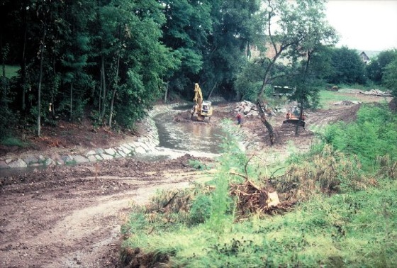 Renaturierung: Renaturierung eines Fließgewässers durch Entfernen der seitlichen Verbauung. Renaturierung: