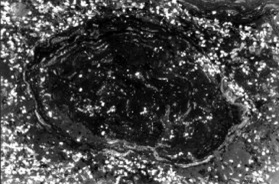 Rhodolith: Rhodolith mit akzessorischen sessilen Foraminiferen (Miniacina) aus dem Thanet (Alttertiär) der Südatlas-Randzone (Marokko): Dünnschliff, Negativvergrößerung 1,12fach. Rhodolith: