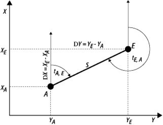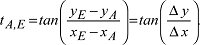 Richtungswinkel, ist der rechtsläufig gezählte Winkel im geodätischen, rechtwinklig-ebenen Koordinatensystem, z.B. im Punkt A zwischen dem nördlichen Zweig der Parallelen zur x-Achse (Linie y-constant) und der Geraden zum Punkt E. Der Richtungswinkel ( Abb.) berechnet sich aus den Koordinaten der Punkte A und E zu:
