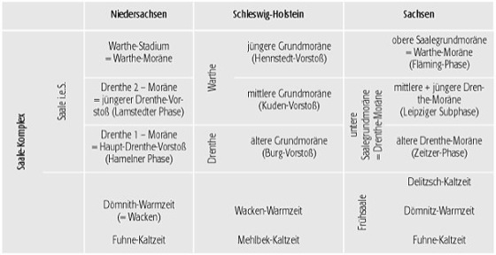 Es können generell drei verschiedene Moränen ausgegliedert werden, wobei die Korrelationen im Detail noch Schwierigkeiten machen und in der Tabelle zusammengefaßt sind. Die Rehburger Endmoräne (Rehburger Phase), ein Höhenzug, der durch ganz Norddeutschland verläuft, ist ein Stauchmoränenzug, der vom Drenthe-Hauptvorstoß überfahren wurde. Alle intra-saalezeitlichen Warmzeiten (Uecker-Warmzeit, Treene-Warmzeit) haben sich bislang nicht bestätigen lassen. Die Schmelzwässer des Warthe-Stadiums flossen durch das Breslau-Magdeburg-Bremer-Urstromtal zur Nordsee. Im Periglazialraum bildeten sich in der Saale-Eiszeit große Schotterfluren, die in Sachsen als Komplex der Hauptterrassen und am Rhein als untere Mittelterrassen bezeichnet werden. [WBo]
