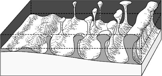 Salzstruktur: Salzstrukturtypen in Abhängigkeit von der ursprünglichen Mächtigkeit des Salzlagers; von links nach rechts: Salzkissen, Salzstöcke, Salzmauer. Salzstruktur: