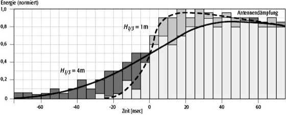 Satellitenaltimetrie: Typische Form eines (normierten) Radarechos der Meeresoberfläche bei einer signifikanten Wellenhöhe von 4 m (durchgezogene Linie). Bei geringerem Seegang (H=1 m) ist die ansteigende Flanke des Radarechos steiler (gestrichelte Linie). Satellitenaltimetrie: