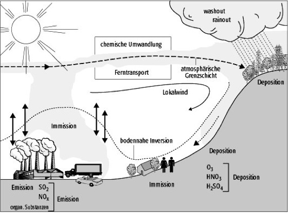 Die einmal freigesetzten Schadstoffe verbleiben nicht am Emissionsort, sondern werden durch die vorherrschende Luftströmung in der Atmosphäre verteilt ( Abb.). Stärke und Richtung des mittleren Windes legen fest, wie schnell und wie weit die Luftbeimengungen innerhalb einer bestimmten Zeit vom Ort der Freisetzung weg transportiert werden. Dabei spielen die verschiedenen Windsysteme auf allen Skalenbereichen eine Rolle. Entlang des Transportweges werden die Schadstoffe durch die vertikale Diffusion auf ein immer größeres Volumen verteilt und die Schadstoffkonzentration, beispielsweise angegeben in g/m3, nimmt immer weiter ab. In Abhängigkeit von der Tageszeit und der damit verbundenen thermischen Schichtung der Atmosphäre erfolgt eine turbulente Vermischung in der gesamten atmosphärischen Grenzschicht. Besonders tagsüber können dabei die bodennah freigesetzten Schadstoffe bis in 1-2 km Höhe gelangen und dort durch die vorherrschende regionale Strömung auch über Ländergrenzen hinweg verfrachtet werden. So tragen nicht nur die in einem Land freigesetzten Luftbeimengungen zu einer Veränderung der Luftqualität bei, sondern auch bestimmte Anteile der Emissionen aus den Nachbarländern (Ferntransport). Gleichzeitig werden auch in Regionen Schadstoffe gemessen, die fernab der Quellgebiete liegen. Der überwiegende Anteil der emittierten Luftbeimengungen aus den einzelnen Quellgruppen ist chemisch nicht inert, sondern unterliegt chemischen und physikalischen Umwandlungen. Viele der dabei ablaufenden Reaktionen werden durch die Sonnenstrahlung in Gang gesetzt oder beschleunigt. Beispielsweise entsteht aus organischen Komponenten und aus Stickstoffoxiden über eine Reihe von Zwischenprodukten letztendlich bodennahes Ozon oder bei Vorhandensein von Wasser in der Atmosphäre können sich durch Oxidation von anorganischen Verbindungen wie SO2 verschiedene Säuren bilden. Durch die unterschiedliche Reaktionsgeschwindigkeit der atmosphärischen Spurenstoffe ist deren Verweilzeit in der Atmosphäre verschieden lang und sie können damit auch unterschiedlich weit verfrachtet werden. Der an einem Ort emittierte Staub verbleibt z.B. in der Nähe der Quelle und wird üblicherweise nicht über die Mikro-Skala hinaus transportiert. SO2, NO2 und Ozon dagegen haben eine charakteristische Lebensdauer von etwa einem Tag und somit eine Reichweite bis in die Meso-Skala hinein. Die sehr langlebigen Komponenten wie Methan und CO2 können dagegen auf der globalen Skala verteilt und wirksam werden. In Abhängigkeit von ihrer individuellen Verweilzeit werden die Spurenstoffe mehr oder minder schnell wieder aus der Atmosphäre ausgeschieden. Je nachdem, ob Wasser in irgendeinem Aggregatzustand an dem Ausscheidevorgang beteiligt ist, unterscheidet man zwischen der trockenen und der nassen Deposition. Bei der trockenen Deposition lagern sich die Luftschadstoffe am Boden, an Pflanzen oder an anderen Oberflächen ab. Diese trocken abgelagerten Verbindungen werden entweder durch Aufnahme in den Wasserfilm, der sich häufig auf den einzelnen Oberflächen befindet, zu sauren Verbindungen umgewandelt und dauerhaft eingelagert, oder aber über Oberflächenprozesse beseitigt. Bei der nassen Deposition laufen die chemischen Umwandlungen bzw. Abbaureaktionen in Wechselwirkung mit einzelnen Komponenten des Wasserkreislaufs (Verdunstung, Wolkenbildung, Niederschlag) ab. Die nasse Deposition wird in die Vorgänge ›rainout‹ und ›washout‹ unterteilt. Beide Prozesse sind wichtige Reinigungsmechanismen der Atmosphäre, wobei zum einen die wasserlöslichen Gase die Wolken- und Niederschlagsbildung fördern und zum anderen gleichzeitig damit die Schadstoffe selbst aus der Atmosphäre entfernt werden. Die atmosphärischen Luftbeimengungen unterliegen einem Kreislauf von der Emission über die Ausbreitung in der Atmosphäre einschließlich möglicher Veränderungen bis hin zur Deposition.