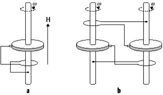Scheibendynamo: Prinzipbilder des unipolaren (a) und bipolaren (b) Scheibendynamos. Scheibendynamo: