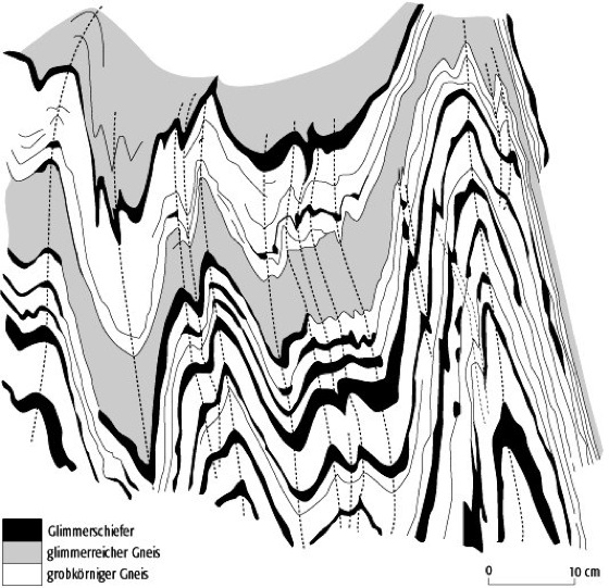 Scherfalte, Falte, die durch Scherung im Winkel zu einem schon früher angelegten Lagenbau entsteht (Scherfaltung). Die Mächtigkeit der Lagen ist parallel zur Scherrichtung konstant. Scherfalten entstehen vor allem in höhergradigen Metamorphiten ( Abb.).