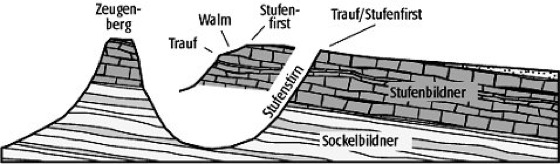 Den höchsten Punkt der Stufe bildet der Stufenfirst (First). Dieser ist meist als Kante zwischen dem Stufenhang und der Stufenfläche ausgebildet. Diese Kante wird als Trauf bezeichnet. Oft ist der Trauf nicht mit der Scheitellinie der Stufe identisch. Der dazwischen ausgebildete, konvexe Oberhangbereich wird dann als Walm, die Stufe als Walmstufe bezeichnet. Die stufenbildende Schicht trägt die Stufenfläche (Stufenlehne). Ihre Neigung und Abdachungsrichtung wird vom Einfallen des Schichtkomplexes bestimmt, jedoch ist der Abdachungswinkel der Stufenfläche geringer als der Einfallswinkel der Schichten, so daß auf der Stufenfläche mit zunehmender Entfernung vom Trauf jüngere Gesteine anstehen, die in einem sehr flachen Winkel geschnitten werden. Die Stufenfläche ist daher eine Abtragungsfläche (Skulpturfläche), deren Anlage und Verlauf jedoch strukturell geprägt ist (Strukturformen). Seltener entstehen sog. Achterstufen, bei denen die Stufenstirn in Richtung des Schichtfallens exponiert ist. Hierfür wurden auch die Begriffe ›konträre Stufe‹ (=Frontstufe) und ›konforme Stufe‹ (=Achterstufe) geprägt. Die Zurückverlagerung der Stufe durch die von subsequenten Flüssen und ihren obsequenten Nebenflüssen (konsequenter Fluß) gesteuerten Abtragungsprozesse läßt Zeugenberge (Auslieger) entstehen ( Abb. 2). Ausmaß und Geschwindigkeit der Rückverlagerung der Stufenstirn werden gesteuert von der Gesamtheit der tektonischen Parameter, den klimatischen Bedingungen sowie dem vorhandenen Abtragungsschutz aufgrund der Vegetationsbedeckung. Sie spiegeln sich unmittelbar in der Prozeßintensität der fluvialen Erosion, den auftretenden Rutschungen (Hangbewegungen) und Massenbewegungen wider. Von zentraler Bedeutung sind damit, neben dem Gefälle und der Wasserführung subsequenter und obsequenter Flüsse, die Intensität der Quellerosion und die Frostwirkung. Schichtstufen weisen meist einen stark zerlappten und gebuchteten Verlauf auf, wodurch sie auf Karten, Luft- und Satellitenbildern gut von Bruchstufen zu unterscheiden sind, die sich einer tektonischen Hauptrichtung unterordnen. Schichtstufenlandschaft. [WA]