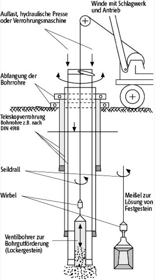 Schlagbohrung: Funktionsprinzip des Freifall-Bohrens (Pennsylvanisches Seilbohren). Schlagbohrung:
