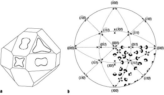Schleifresistenz: Schleifresistenz des Diamanten: a) Härtekurven auf den wichtigsten Flächen, b) qualitative Angaben der Härte in den verschiedenen Richtungen (schwarze Segmente sind nicht schleifbar). Schleifresistenz: