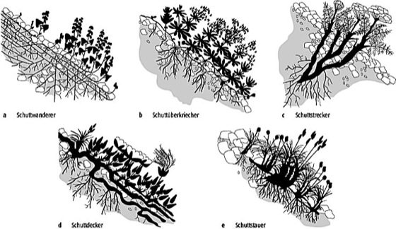 Die Schuttflurvegetation verfügt über besondere Anpassungen, wie z.B. weitreichendes, zugfestes Wurzelsystem (daher als Schuttfestiger geeignet), gute Regenerationsfähigkeit, hohe Samenproduktion und Fähigkeit zur Etiolierung (starkes und schnelles Längenwachstum des Sproßes) bei Keimung in tieferen Schuttschichten. Schuttpflanzen wurzeln meist in tiefen Schichten, die beruhigt und feucht sind sowie eingebrachte Feinerde (organischer und anorganischer Flugstaub) enthalten. Schuttpflanzen können nach ihren Wuchsformen unterschieden werden ( Abb.): Schuttwanderer (durchziehen den Schutt mit langen, sich bewurzelnden Kriechtrieben), Schuttüberkriecher (legen sich mit dünnen Trieben über den Schutt), Schuttstrecker (strecken aufrechte Sproßtriebe durch den Schutt), Schuttdecker (bilden wurzelnde Decken auf dem Schutt) und Schuttstauer (bilden mit einem dichten Feinwurzelwerk, mit Polstern und Horsten Hindernisse für den rutschenden Schutt). Nur die Schuttüberkriecher können flächige Humusdecken bilden und damit die Bildung von Schuttrankern (Ranker) bzw. Schuttrendzinen (Rendzina) einleiten. An ruhenden Standorten können dann konkurrenzstärkere Rasenpflanzen die Pioniervegetation ablösen. Sonst werden durch Schuttpflanzen nur punktuelle Humusinseln geschaffen.