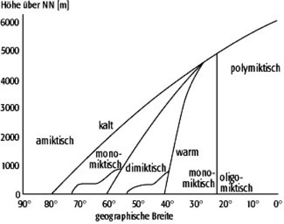 Entsprechend der verschiedenen morphologischen Gestalten, der geographischen Lage und Höhenlage werden Seen nach folgenden Zirkulationstypen geographisch eingeteilt: a) amiktisch: polare Seen mit permanenter Eisdecke; vor allem in der Antarktis, z.T. in der Arktis und im extremen Hochgebirge; keine Zirkulation. b) kalt-monomiktisch: Seen der polaren und subpolaren Zone; Vollzirkulation nur im Sommer; vorwiegend Eisbedeckung und Winterstagnation. c) dimiktisch: Seen der gemäßigten Zone im Norden von Nordamerika und in Eurasien mit Vollzirkulation im Frühjahr und Herbst. d) warm-monomiktisch: subtropische Seen mit Vollzirkulation im Frühjahr. e) oligomiktisch: tropische Seen mit seltener und unregelmäßiger Vollzirkulation. f) warm-polymiktisch: Tropenseen mit häufiger Vollzirkulation, bei denen die Zirkulation oft von der nächtlichen Abkühlung abhängt. g) kalt-polymiktisch: Seen in tropischen Hochgebirgen mit nahezu ständiger Zirkulation. Die Mixis-Typen der Seen in verschiedenen geographischen Breiten und Höhenlagen zeigt Abbildung 3.