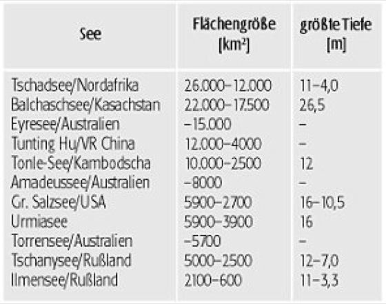See (Tab. 2): größte Seen der Erde (geordnet nach der Fläche, ohne Seen mit großen Schwankungen der Fläche). See (Tab. 2):