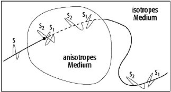 seismische Anisotropie: Doppelbrechung von S-Wellen bei Ausbreitung durch ein anisotropes Medium. Eine einfallende Welle spaltet sich in zwei S-Wellen S1 und S2 auf. seismische Anisotropie: