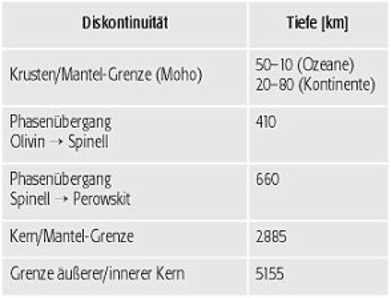 seismische Diskontinuität (Tab.) : Liste der wichtigsten seismischen Diskontinuitäten. seismische Diskontinuität (Tab.)