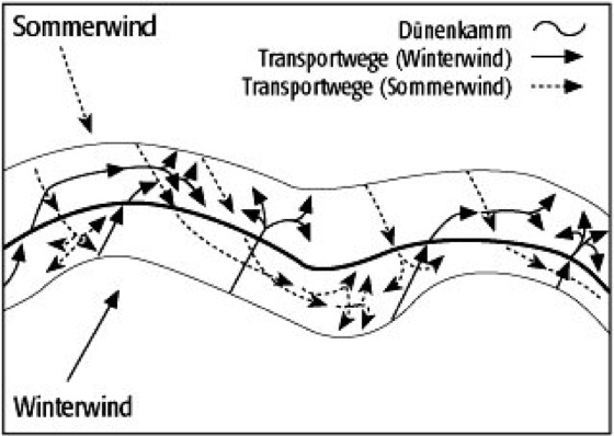 Sif, Seif, [arab.=Säbel], freie Düne; Grundform vieler Längsdünen, deren Kamm mit etwa 20º geneigten Flanken, meistens mit leichter Biegung, in Hauptwindrichtung verläuft. Sie entstehen durch saisonal wechselnde Winde, die einen Winkel bilden ( Abb.). Die Düne ist nur im Kammbereich aktiv, der je nach vorherrschender Windrichtung zu Luv- und Leehängen umgeformt wird. Im Querschnitt haben Sif daher eine flankenparallele, gegeneinander einfallende Schichtung. Im Gegensatz zu Barchanen sind Sif stationär, können sich aber verlängern. Schräg auftreffende Winde (35-50º) können auf der Leeseite wirbelartig umgelenkt werden und dort dünenparallelen Transport zur Folge haben (Saltation). Die Biegung am Ende der Düne zeigt die jeweils dominierende Windrichtung an.