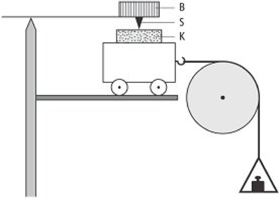 Sklerometer: schematische Darstellung des Sklerometers (B=Gewicht, S=Ritzwerkzeug, K=Kristall). Sklerometer: